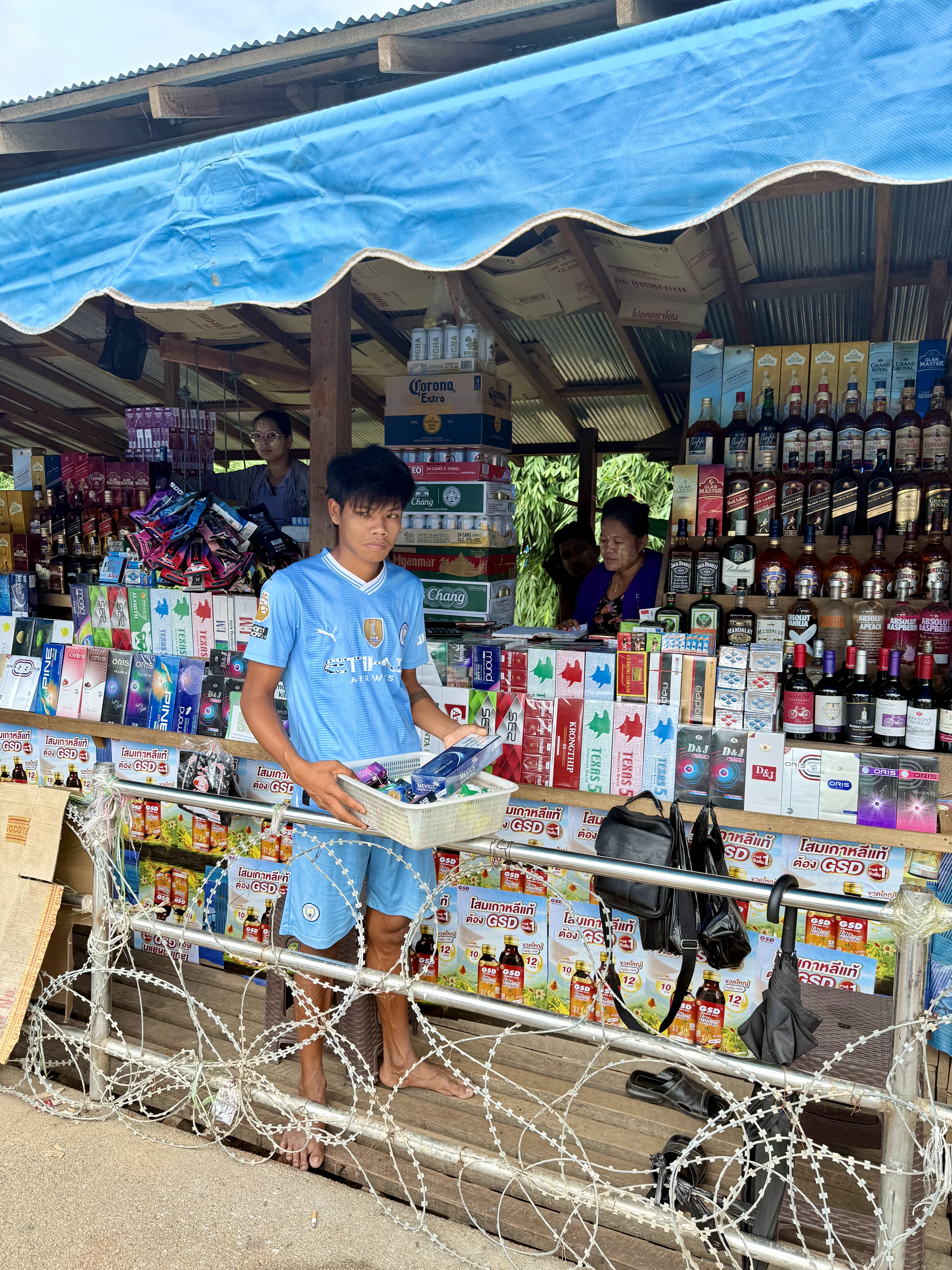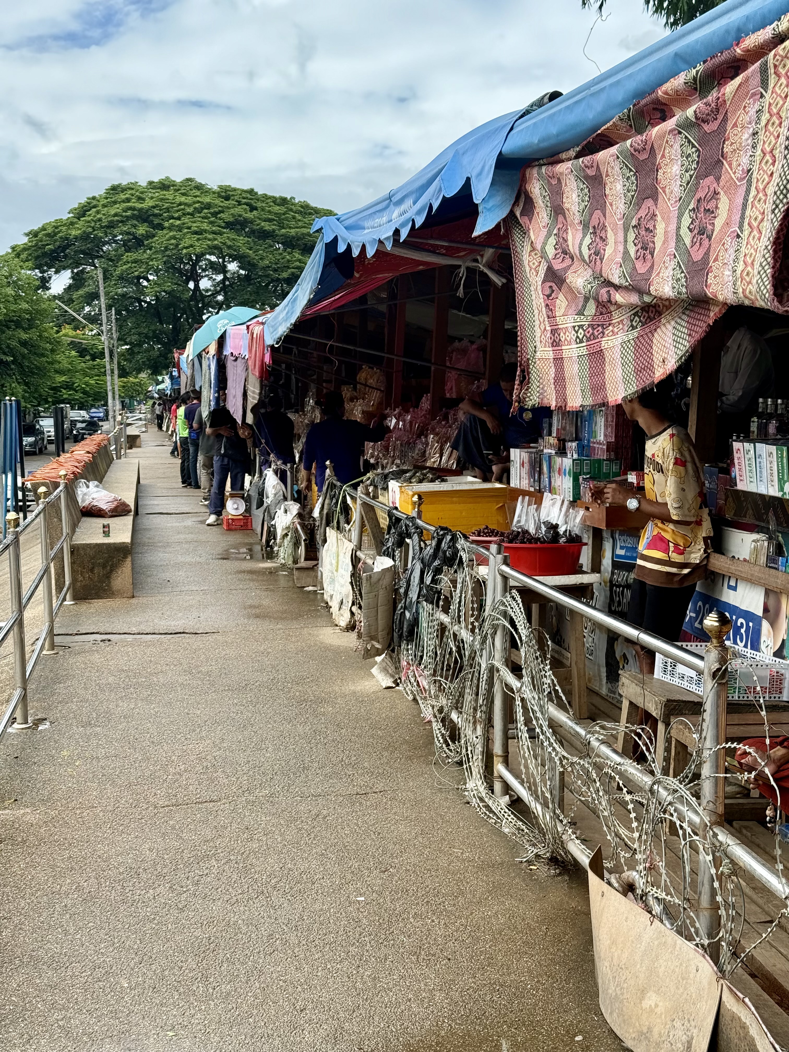 Setting off at 9:45, the first stop was just 8 kms away, the Thai-Myanmar border. There is a market which seems to straddle the border fence (which is the river Moei). There is a platform constructed where Myanmar locals sell across a barbed wire “border fence “ (in quotations because this seems to be for show only), with armed Thai guards patrolling along this wall. They are selling everything from cigarettes, alcohol, viagra, to fresh produce like garlic and other staples like dried fish.