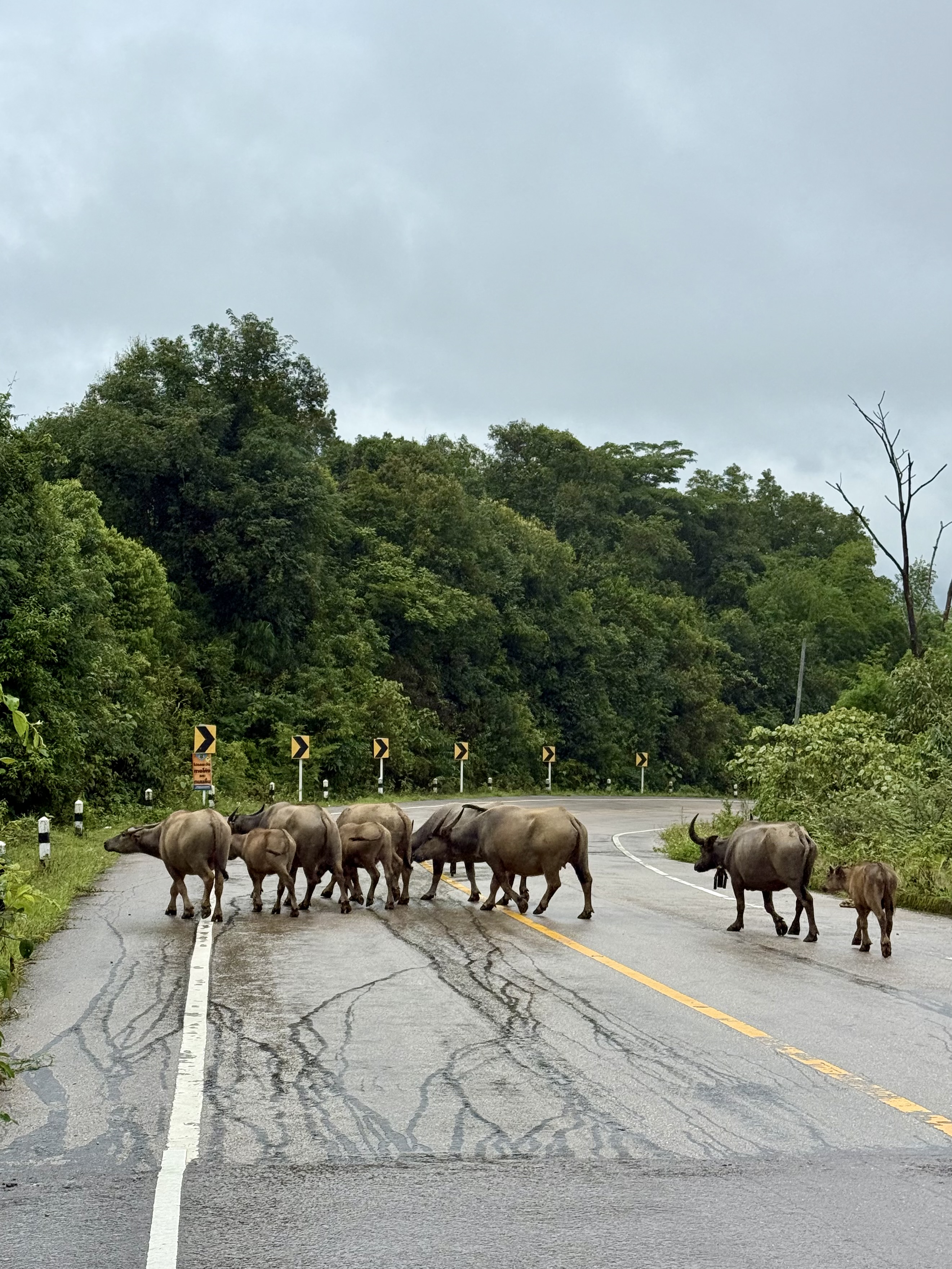 It was in the mountains, with my hands drenched with rain (my rain gear and boots held up pretty well) that i felt cold for the first time. I say this without meaning it in a negative light! I was incredibly grateful to be on the road, in the twisties in the wet. In some respects, this is a natural state of the road and an authentic expression and interaction with the environment. In one moment, my ride was briefly interrupted by a herd of water buffalo.