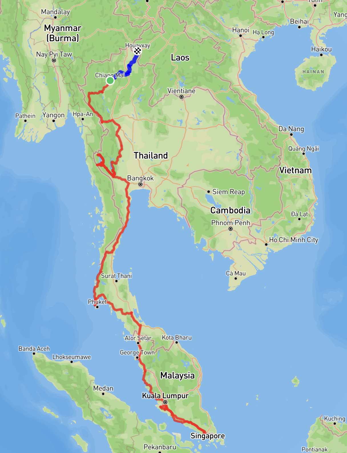 Progress so far. Country #3 awaits (excluding Singapore, which I didn’t ride my bike into)