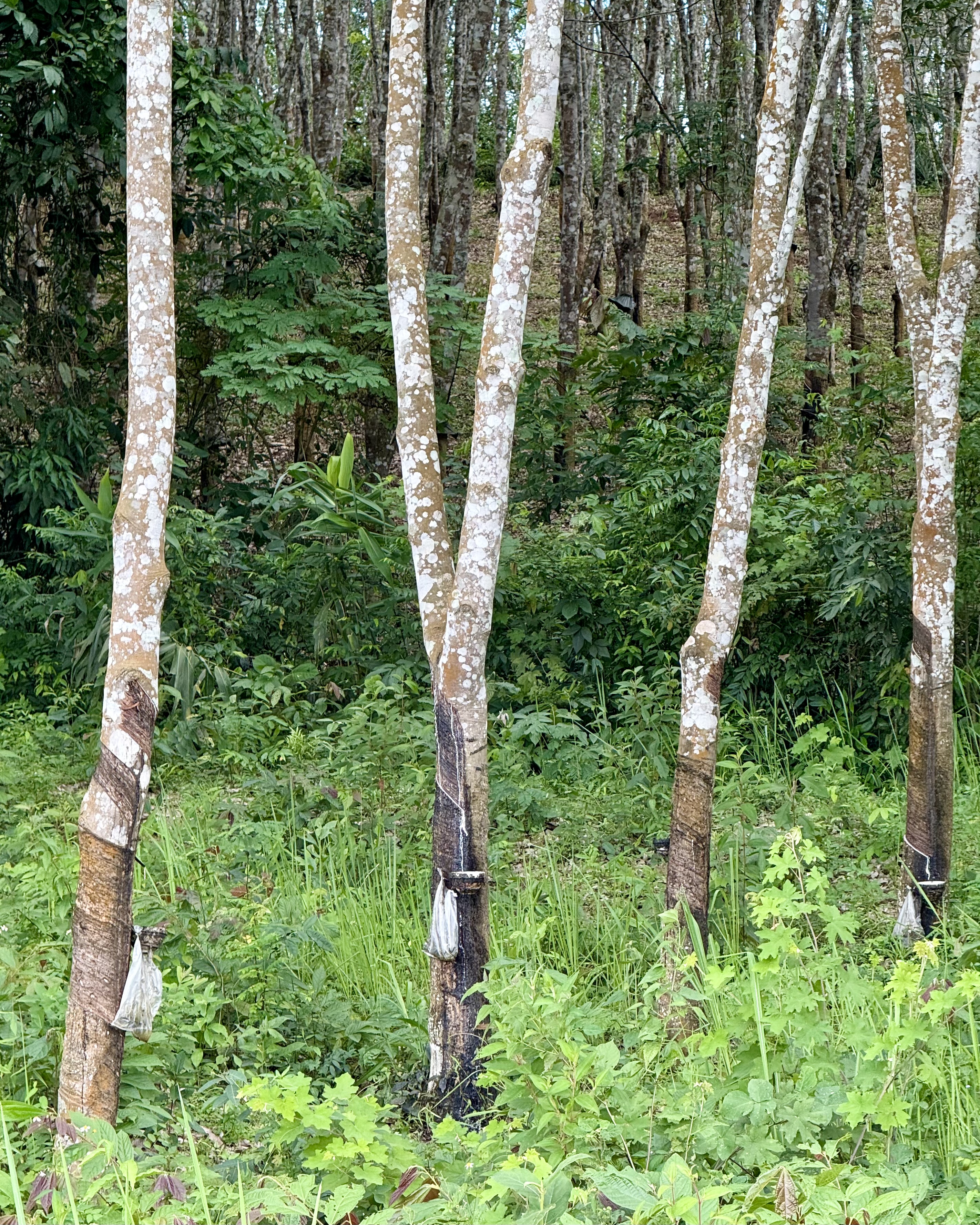 Tapped rubber trees along the roadside