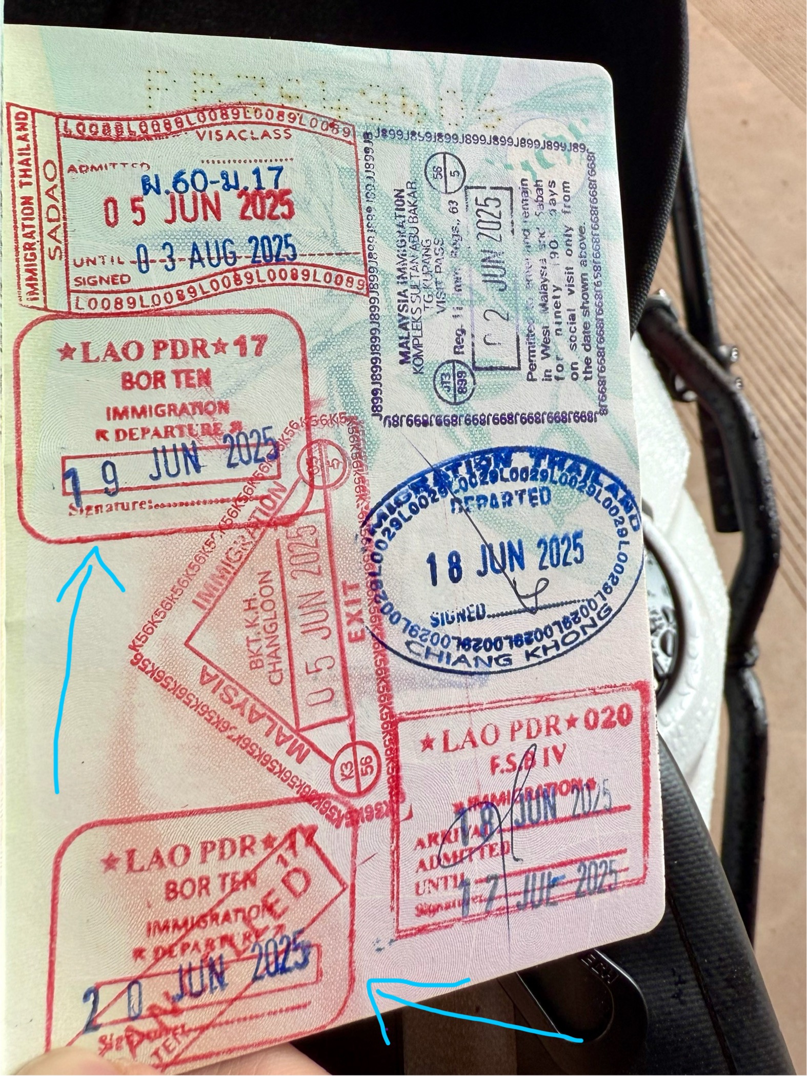 The Laos border was very convenient. We parked our bikes (I stayed on mine for fear of it falling over after dismounting), the official came to retrieve our documents, and then filled out the exit paperwork for us(!) - I did not need to fill out my departure card! Then returned our documents. Then, in a hurry, they came back, there was a bit of a kerfuffle, and as it turns out - they had set the date stamp to the incorrect setting this morning, and only realised with our exit. They “cancelled” the incorrect stamp, and replaced it with one with the correct date.