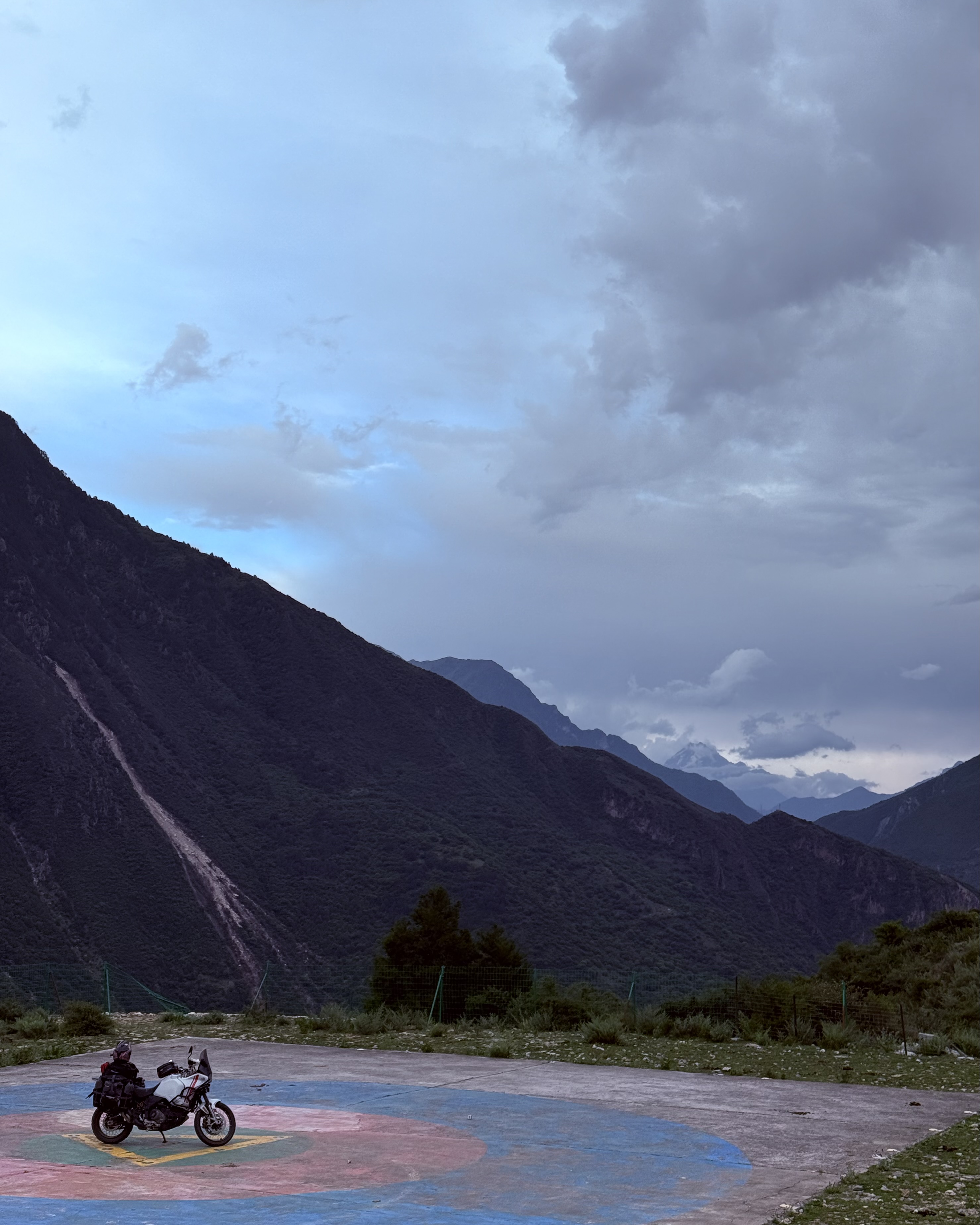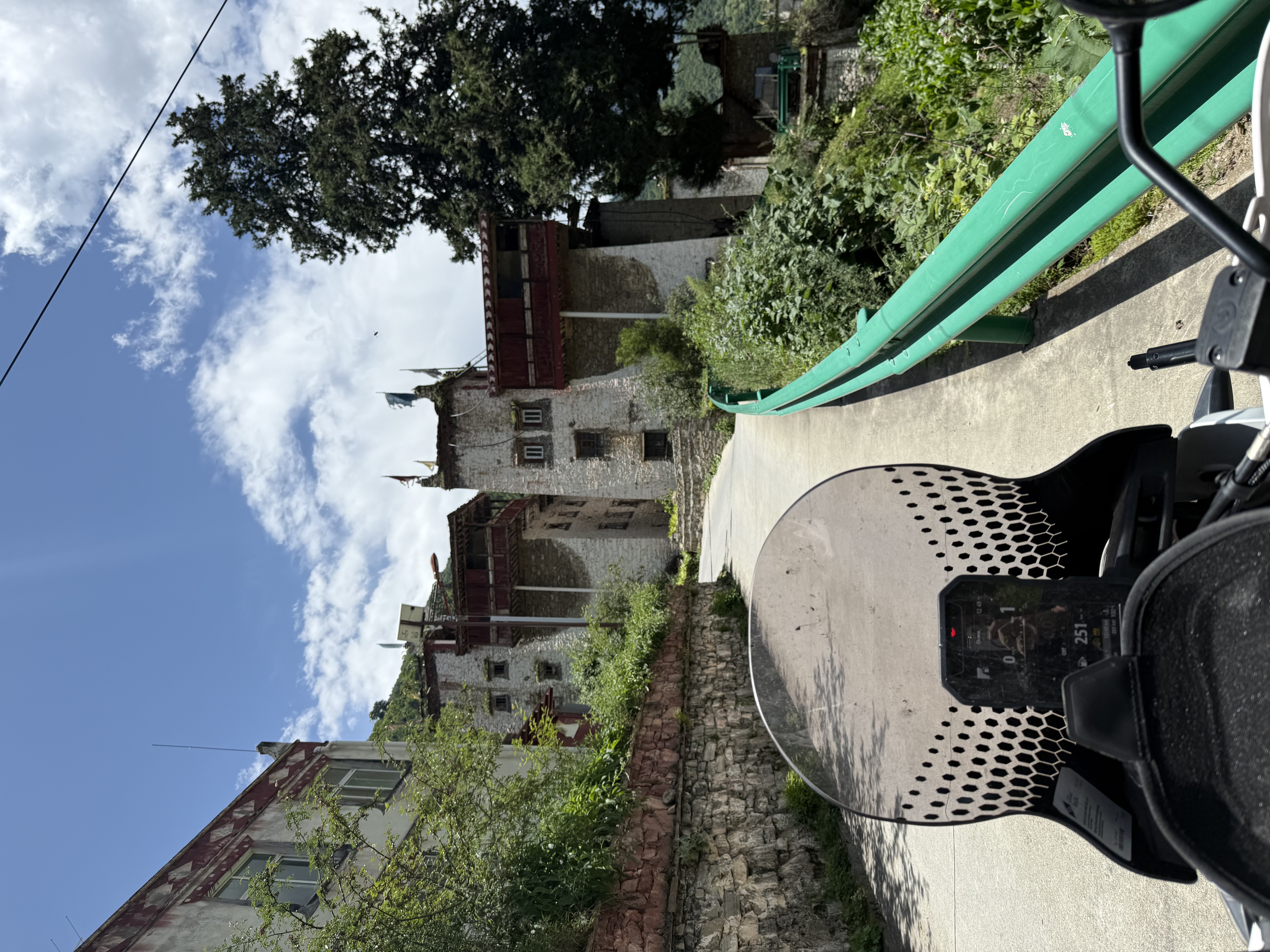 I’m getting more comfortable riding my bike up steep terrain and navigating tight turns. First gear, enduro mode, patience is all you need. And after countless hairpins, I reached the village. A bit nervewracking, but quite fun. The village itself was relatively uneventful. A hall had Tibetan techno sounding music, but all else was quiet. No stores, or anything. I turned around halfway through the village (I was afraid of being overly ambitious; and it seemed to get steeper and narrower as I ascended).
