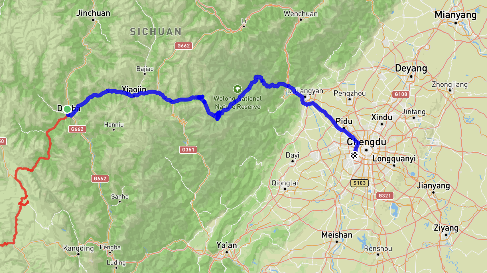 Today’s ride takes us to the first large Chinese city of this trip: Chengdu. This is something I’ve been looking forward to for a while; I haven’t been able to find proper hand sanitizer in the rural towns, I’m keen to be driven around and to wear normal clothes, and a break from the daily riding routine is welcome!