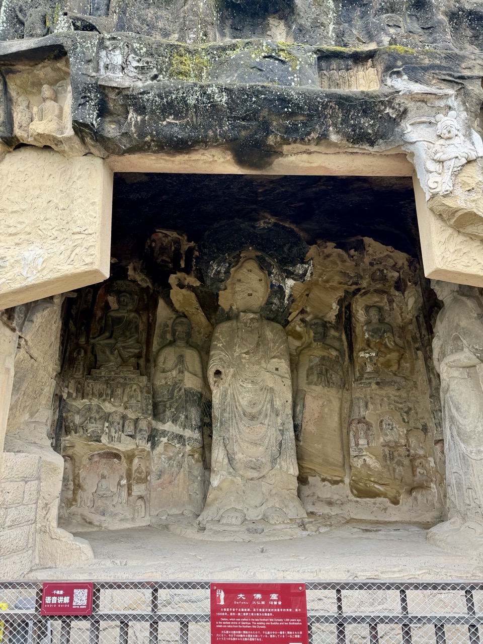 This was a large number of Buddha statues carved into the cliff face along the river, with many of these carved in the period from 500-1000 CE. It was quiet when we arrived, with few other tourists. In the distance, a bullet train whizzed by, while locals were swimming in the river.