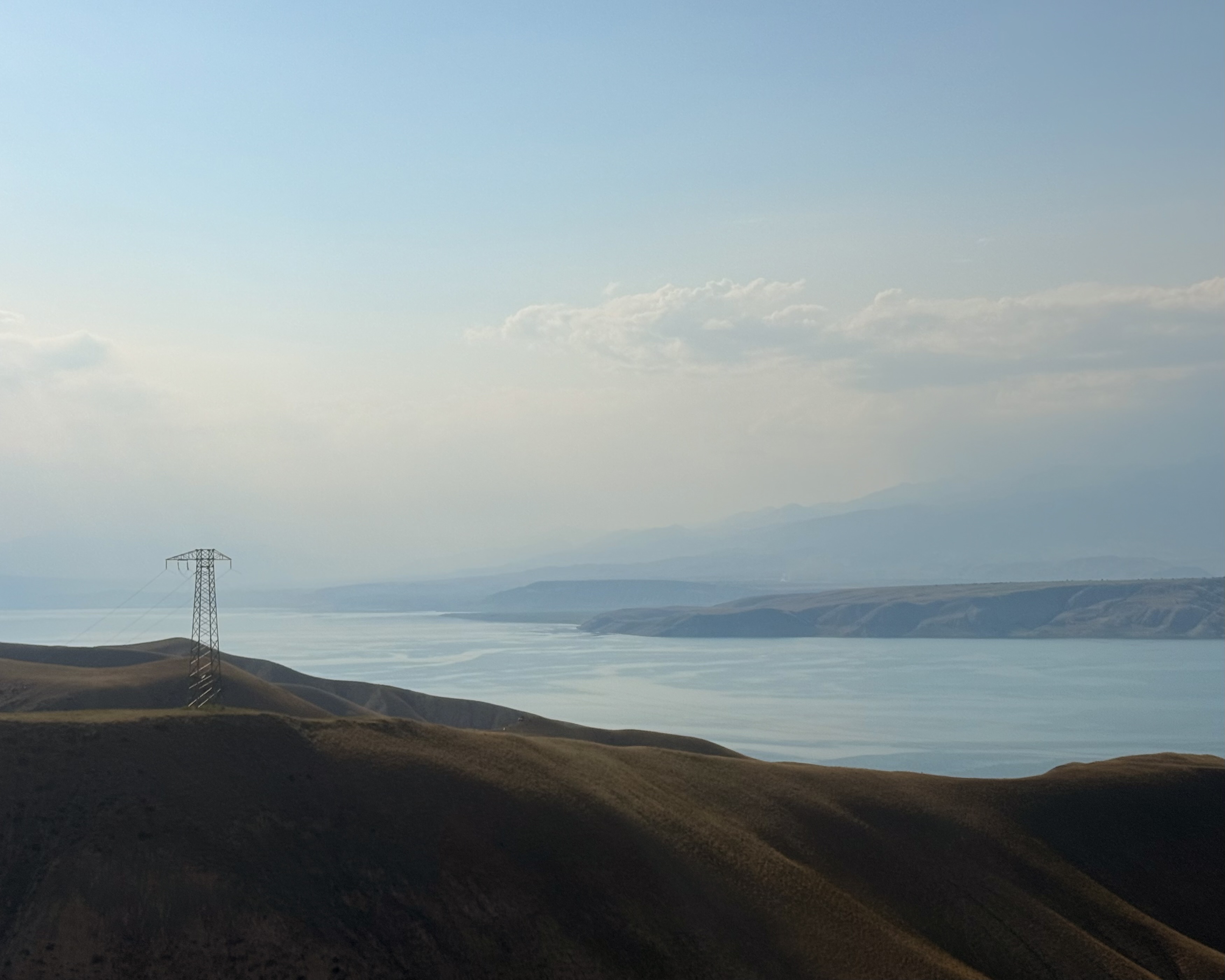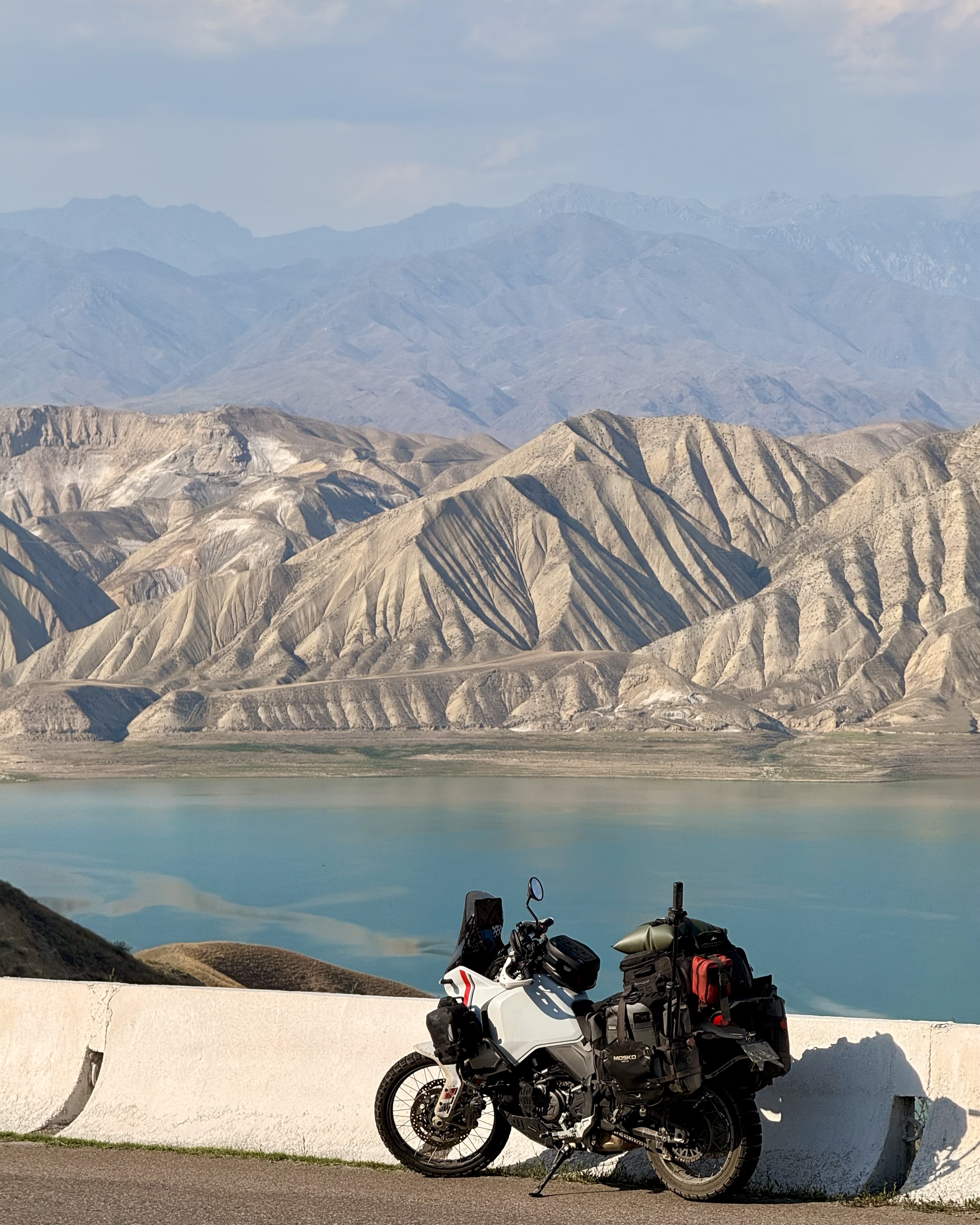 The scenery around the reservoir is some of the best I’ve ever seen on this trip and in my life. The hills billow like ruffled feathers, and host a myriad of colours. In the distance, intense rocky mountains can be seen. The lake shines turquoise, and has different surface textures, sometimes mirror like and other times matte.