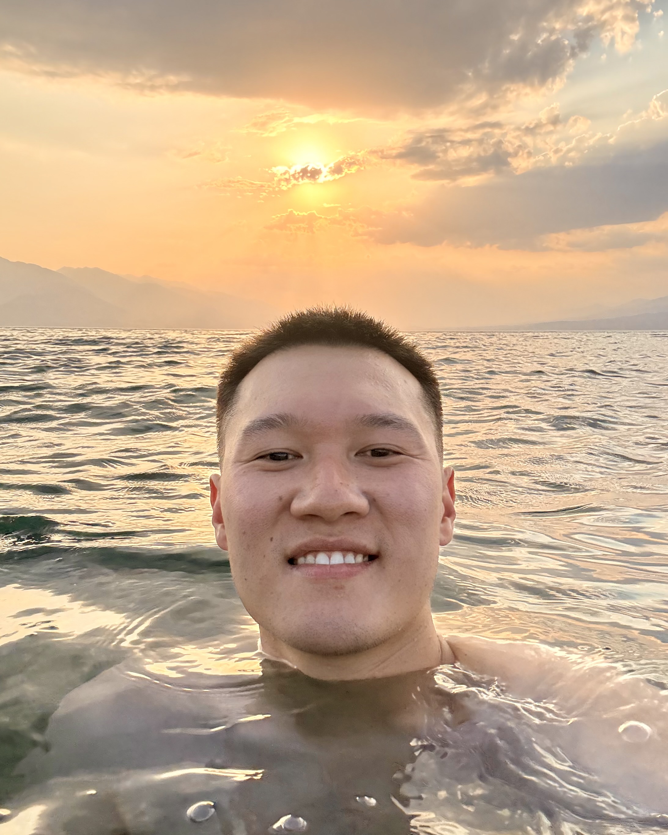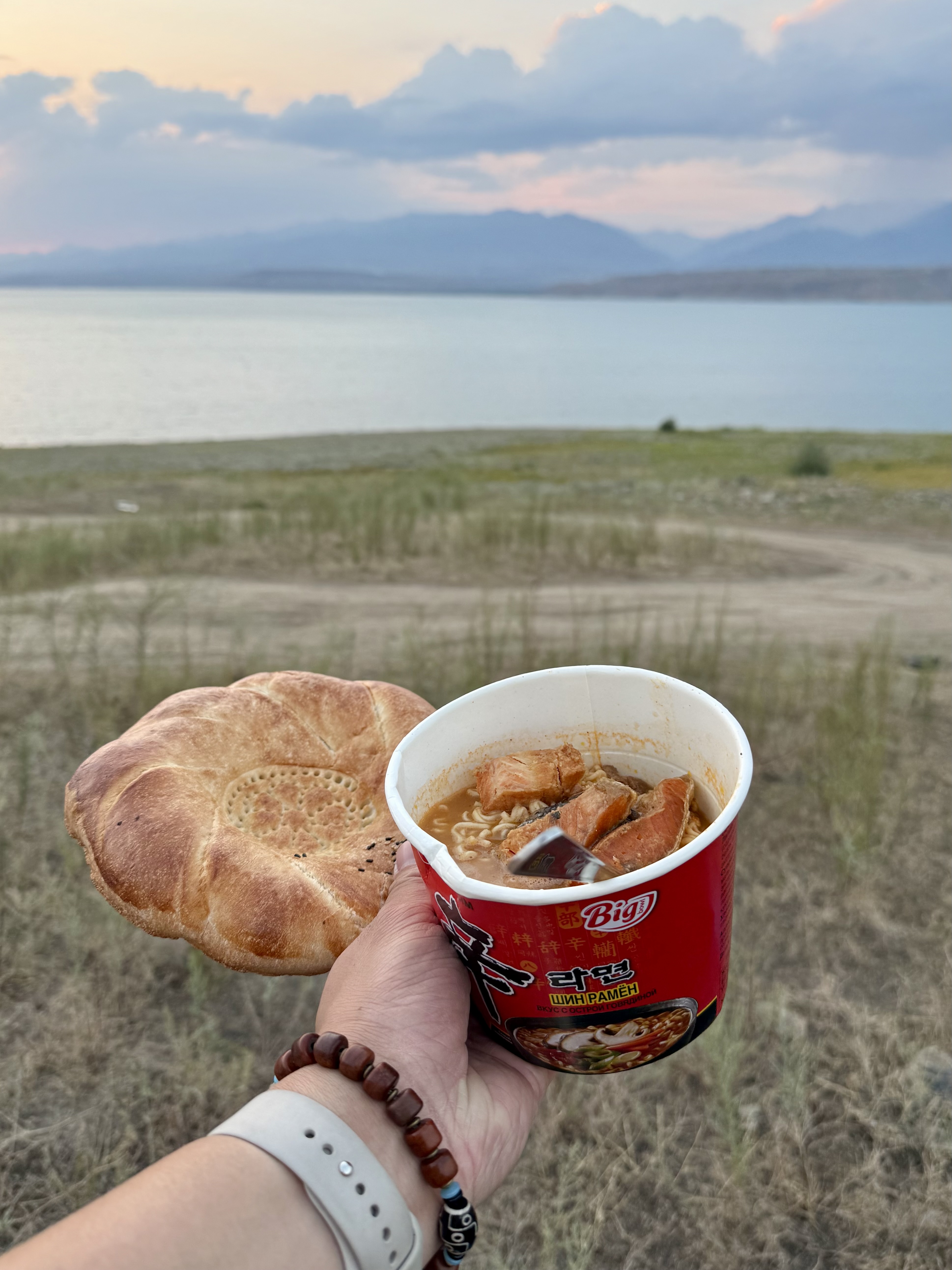 Near the suggested town, I spotted a dirt road down to a beach. It was so picturesque, and the idea of taking a bath in the lake took root in my thoughts. But first, I needed to get supplies for dinner. At a roadside shop I purchased 3 litres of water, Kyrgyz bread, and 5 eggs, and some fried fish from a mountainside restaurant.