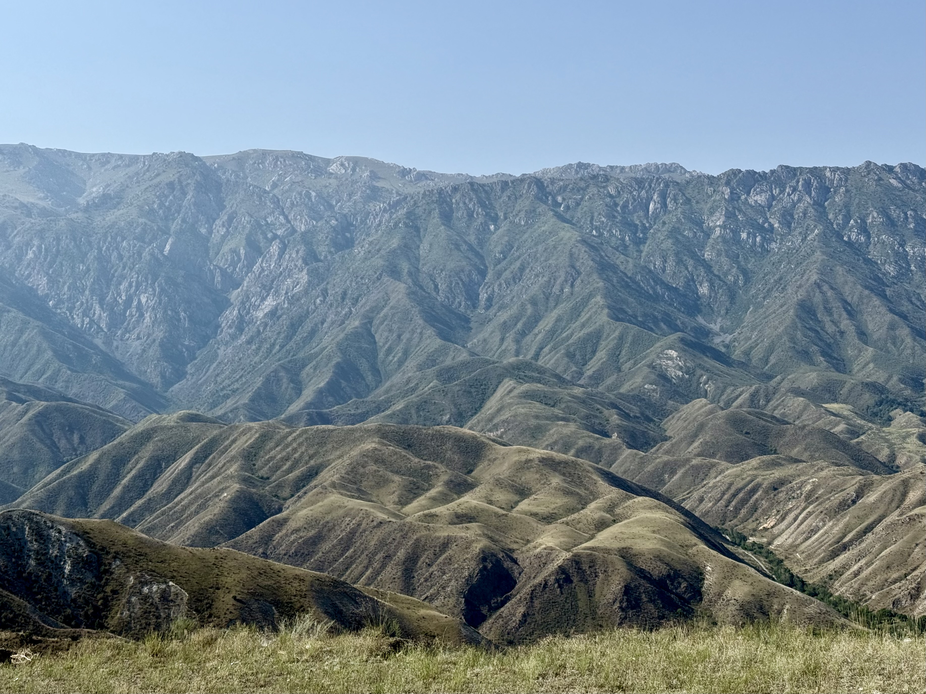 Today’s route was rather long, tracing the Uzbek border at the Fergana Valley the long way around. The scenery is primarily agricultural fields with a smattering of hills and valleys, and less interesting than yesterday, but the roads are decent in some areas (although other areas have deep tyre ruts left by commercial traffic). I spent most of my time on the road, keeping stops short and to a minimum.