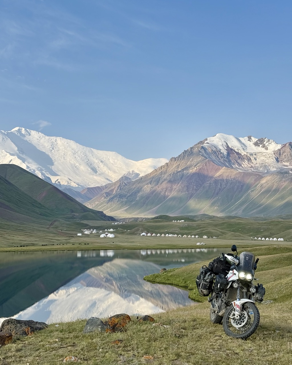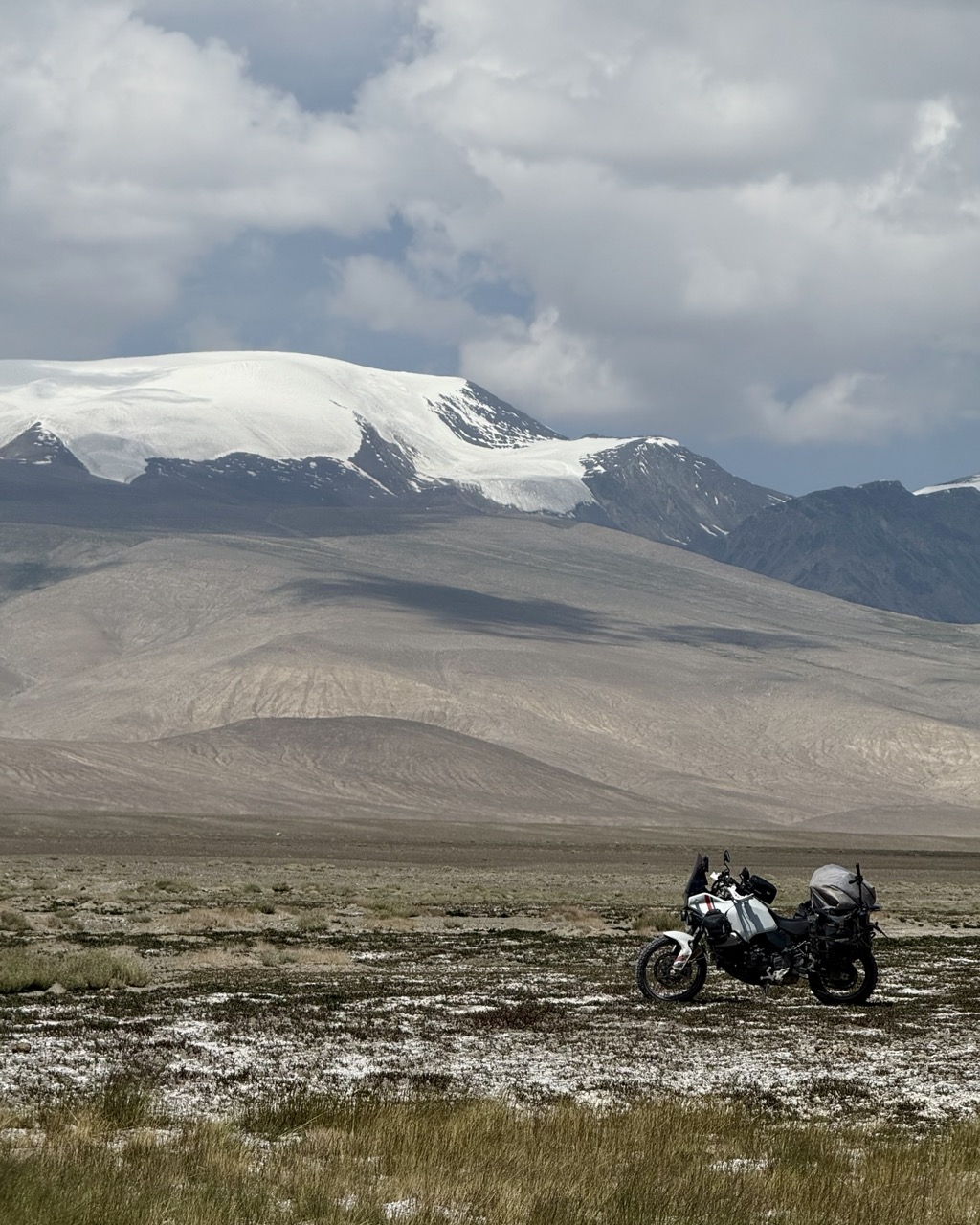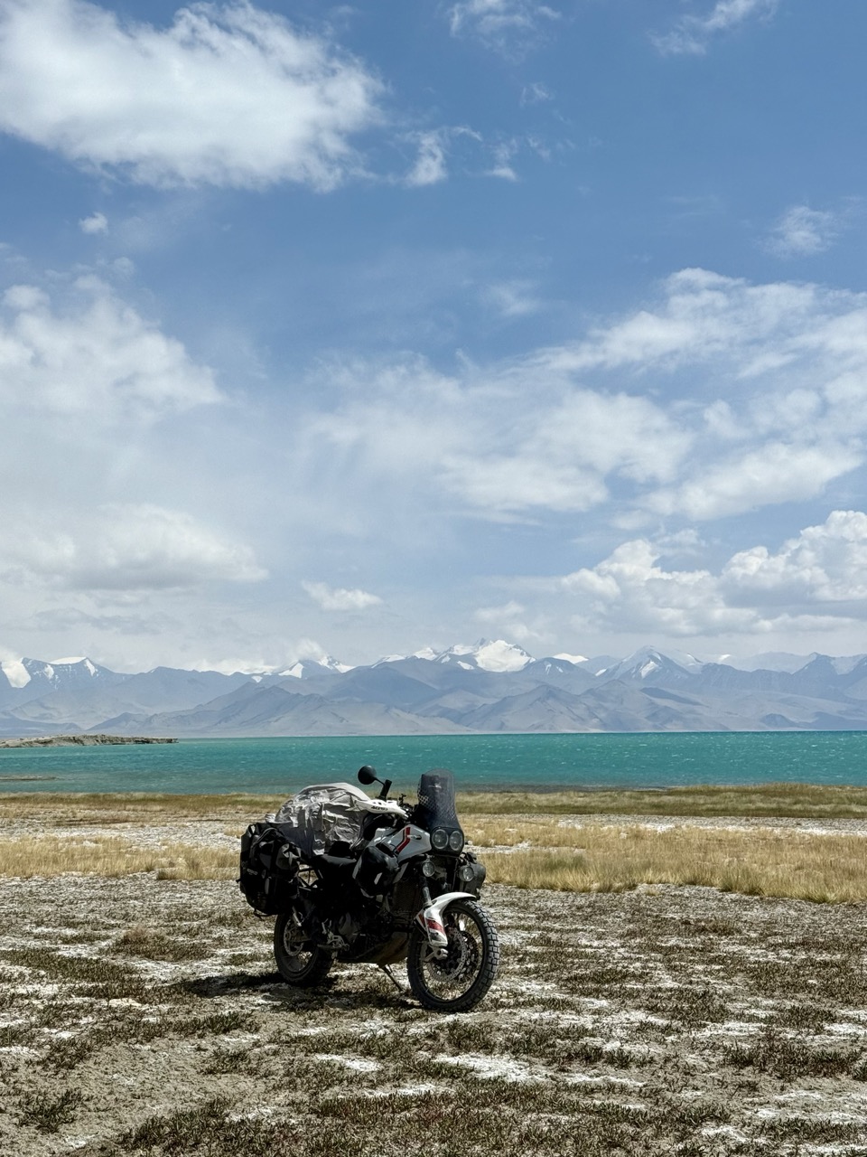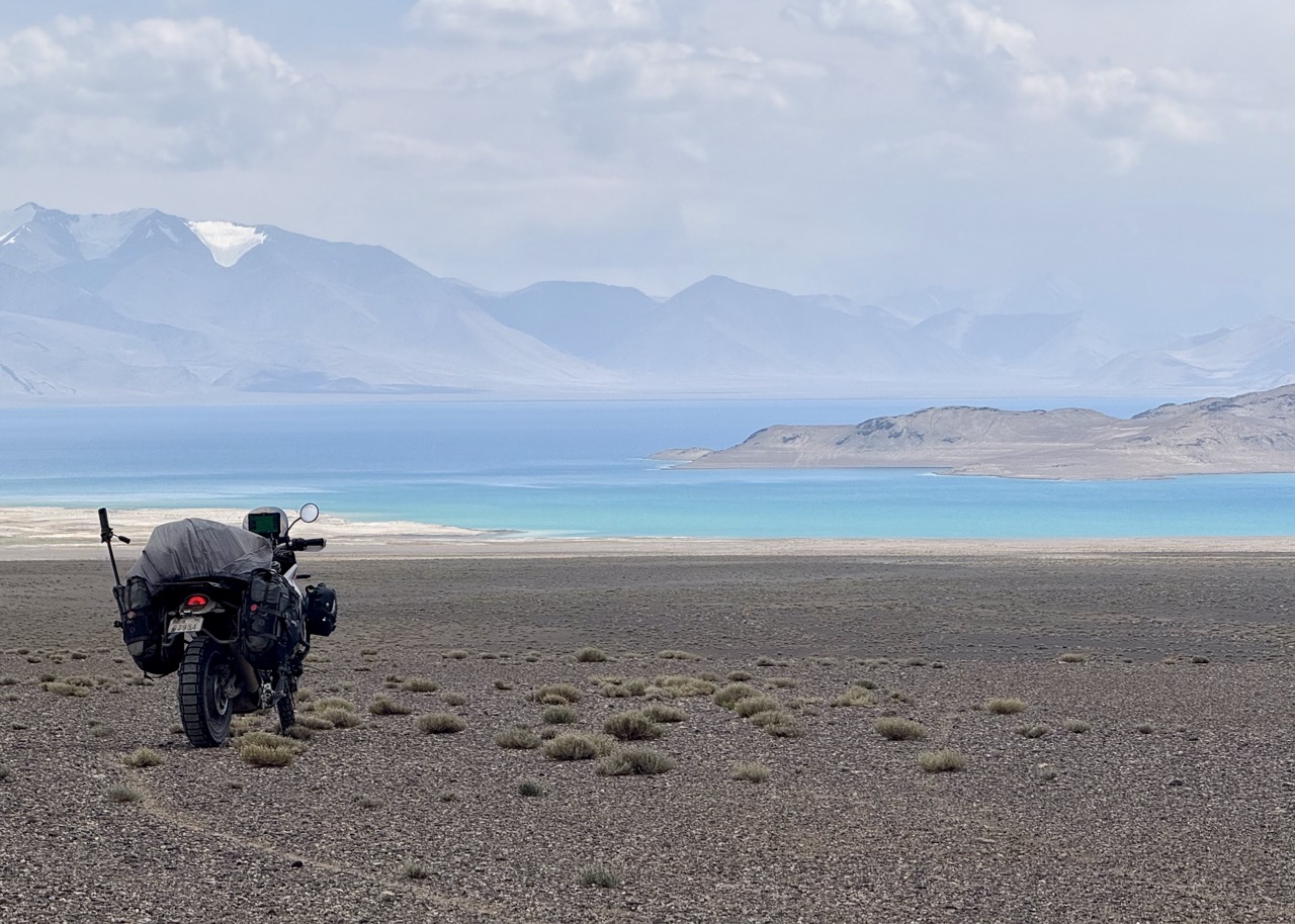 We got off the highway and explored the surrounds of the lake, including the lake shore itself. Riding here was similar in parts to riding on sand, with the occasional loss of traction. Again, very glad to have learned to ride on sand beforehand! The shoreline was also much much further away than it looked, which seems to be a feature of the Pamir region. The mountains bordering the road are so large, that they make large distances look very small, and you only really realise this when you try to go towards faraway objects.