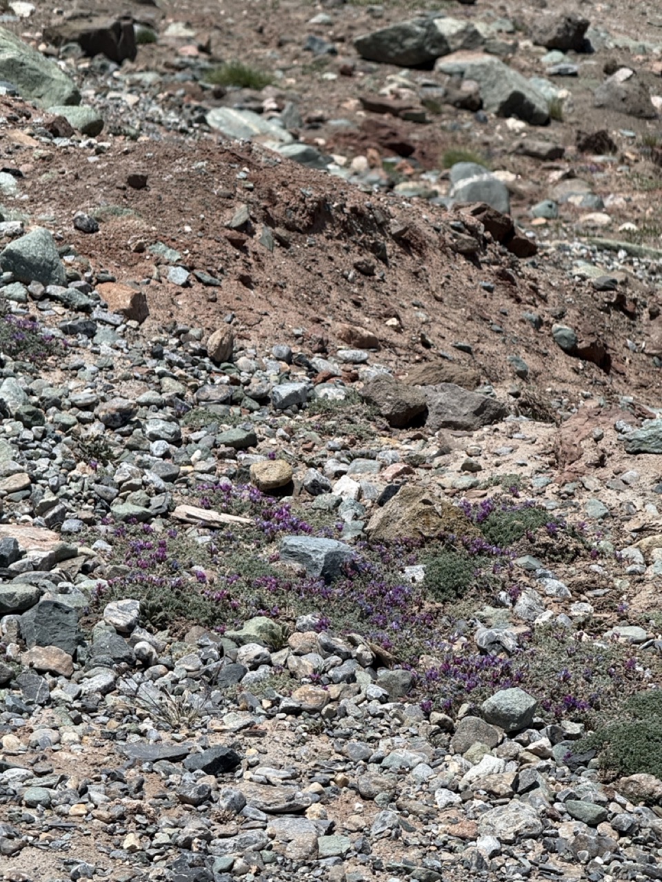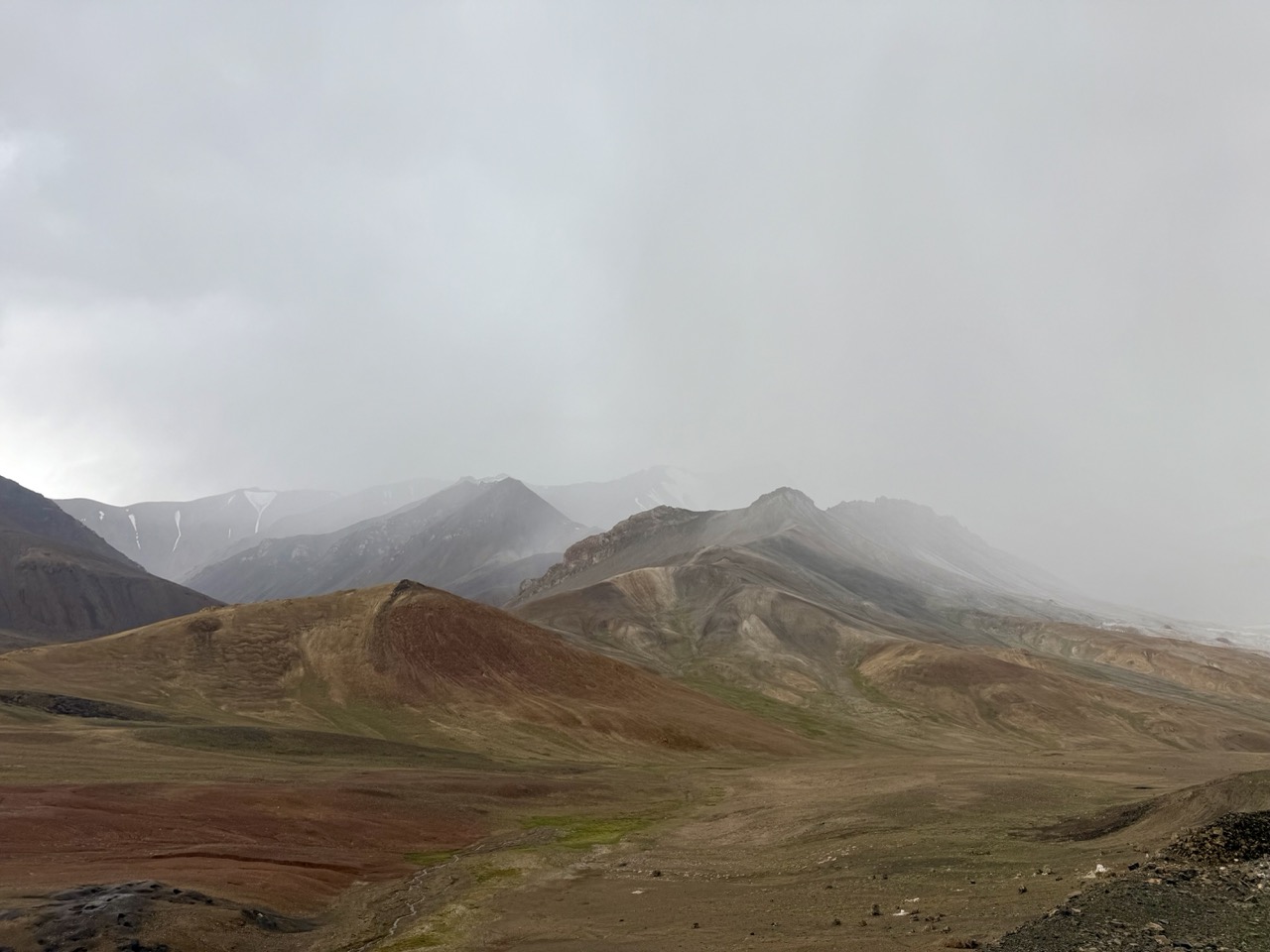 After crossing the Tajik border, the scenery was completely different to the Kyrgyz side of the mountains. It was a landscape with jagged rocky mountains with colours varying from white, to orange, to red, to black. There was very little green - almost no plants at all - save for small and delicate yellow and purple flowers. Some mountains resembled Jupiter, with others looking more like Mars.