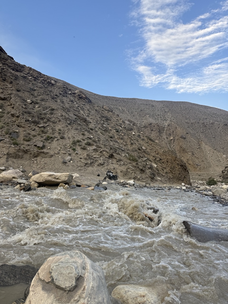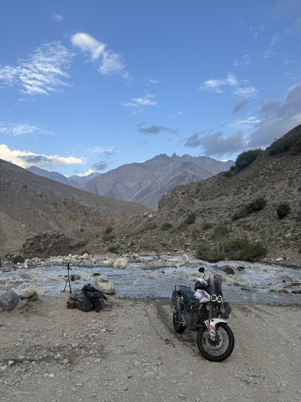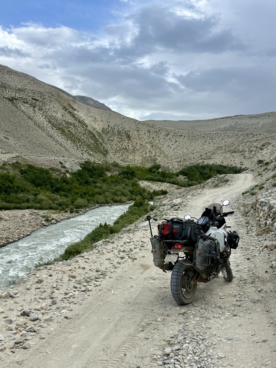 Eventually i passed by a few people who had set up camp by the river at a rare patch of grass. I stopped and they walked over to say hello. They were two Aussies, who could have been father and son, riding DRZ650s from Italy to Nepal. They had come from the other way and had crossed the river a few hours earlier. “Yeah nah, you’ll be right mate, piece of piss” when I asked about it. Quite a contrast from the Russian who looked like he had seen a ghost! I decided that the water flow had probably been different now vs in the morning when the Russian had crossed, and that it was worthwhile checking out and having a crack.