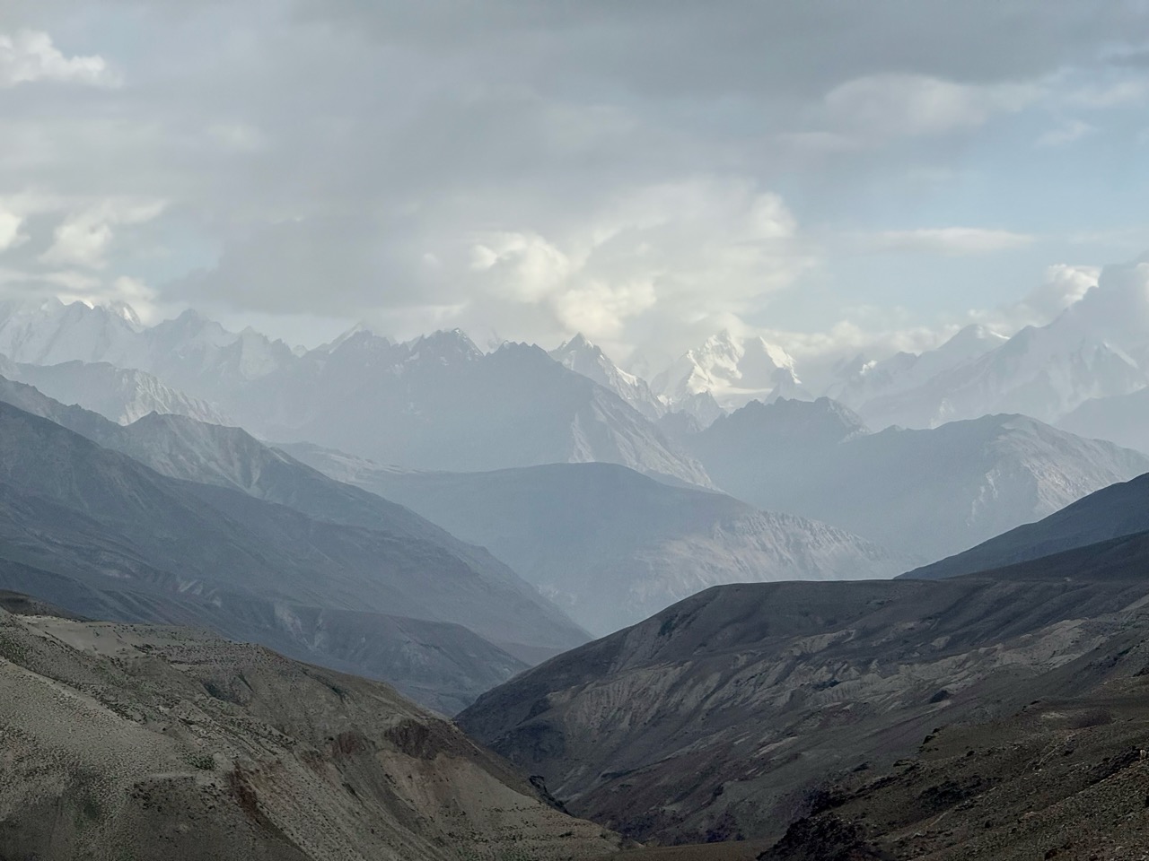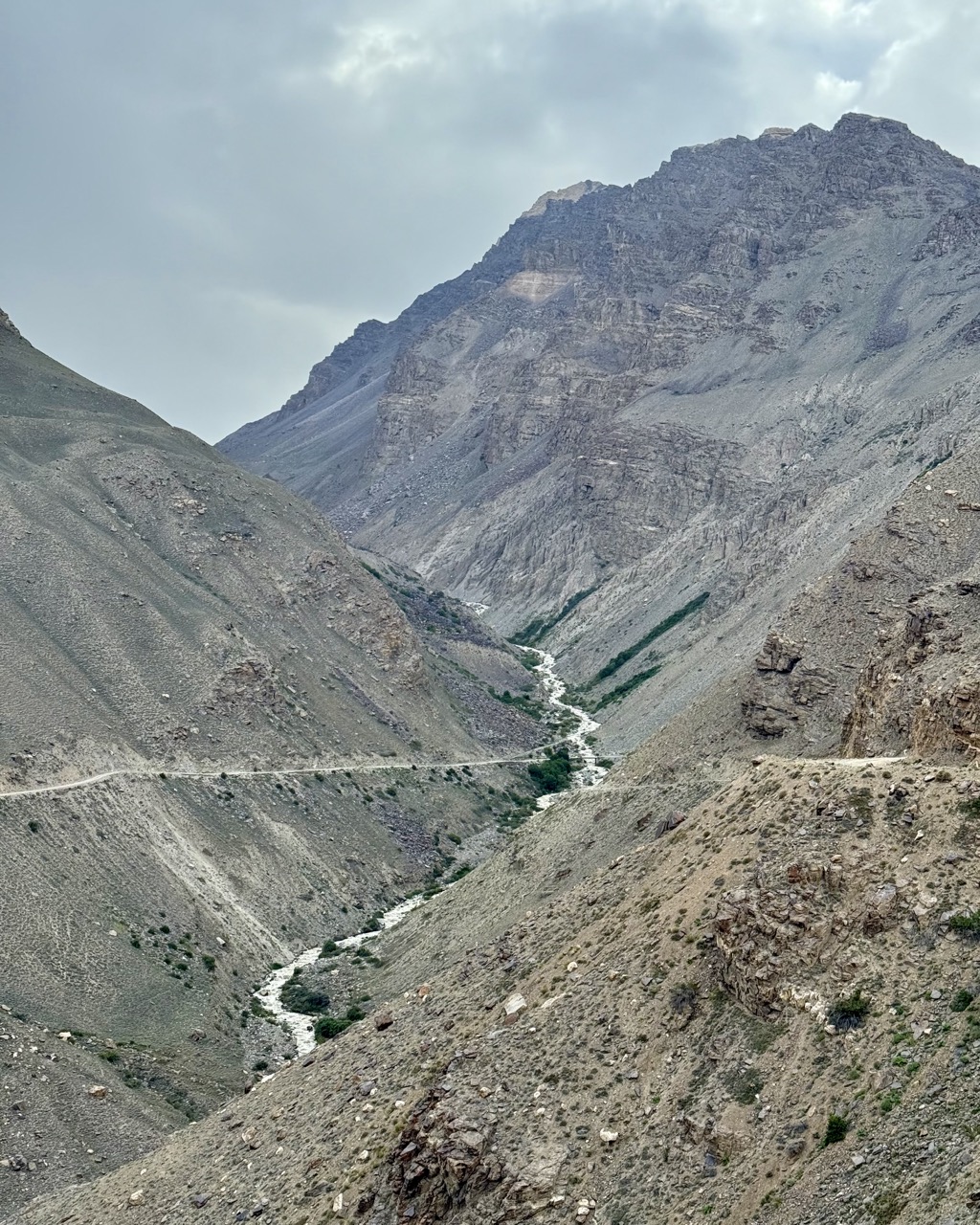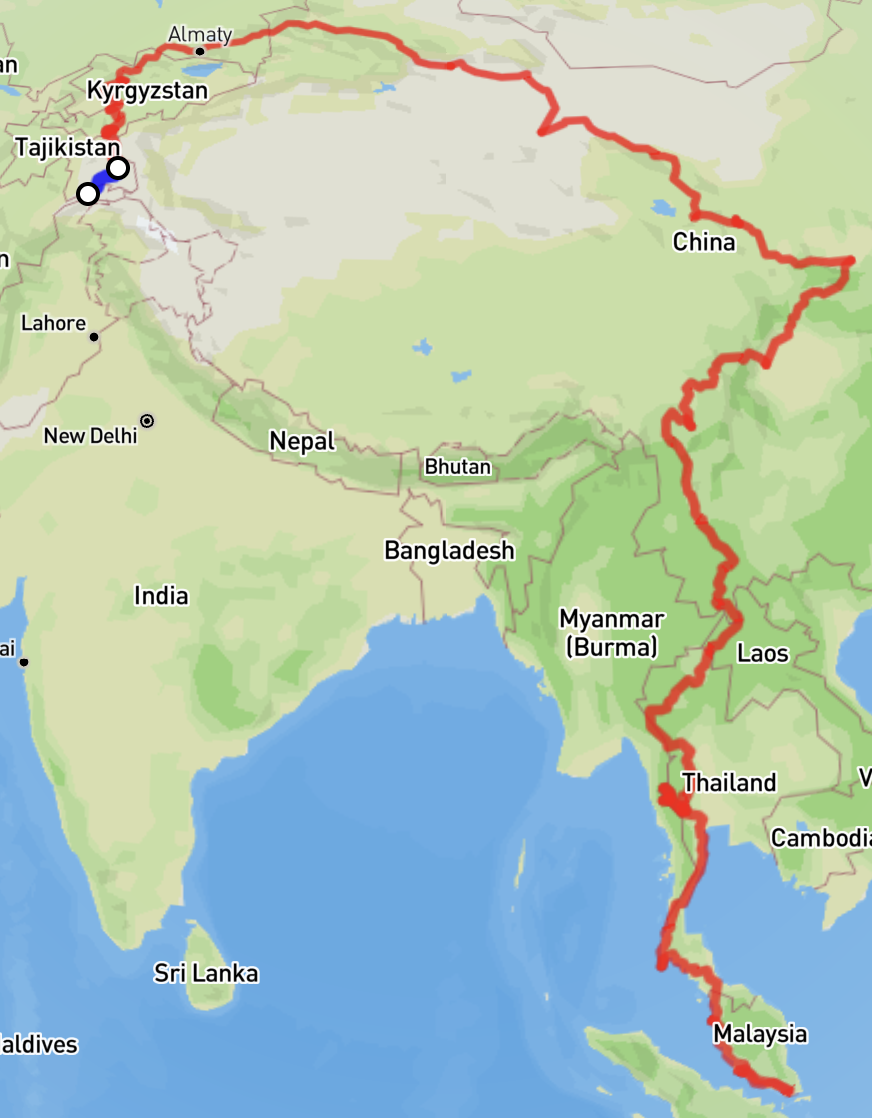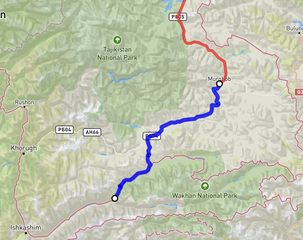 About half way through the route, it turns into the Wakhan corridor, which runs alongside the border with Afghanistan (the long panhandle bit which was there since colonial times to serve as a buffer between great powers. This panhandle is also is a dramatic mountain range, the Hindu Kush range, with a snowy peak >7000 MASL). This route is primarily unpaved, and is known to be a challenging ride.