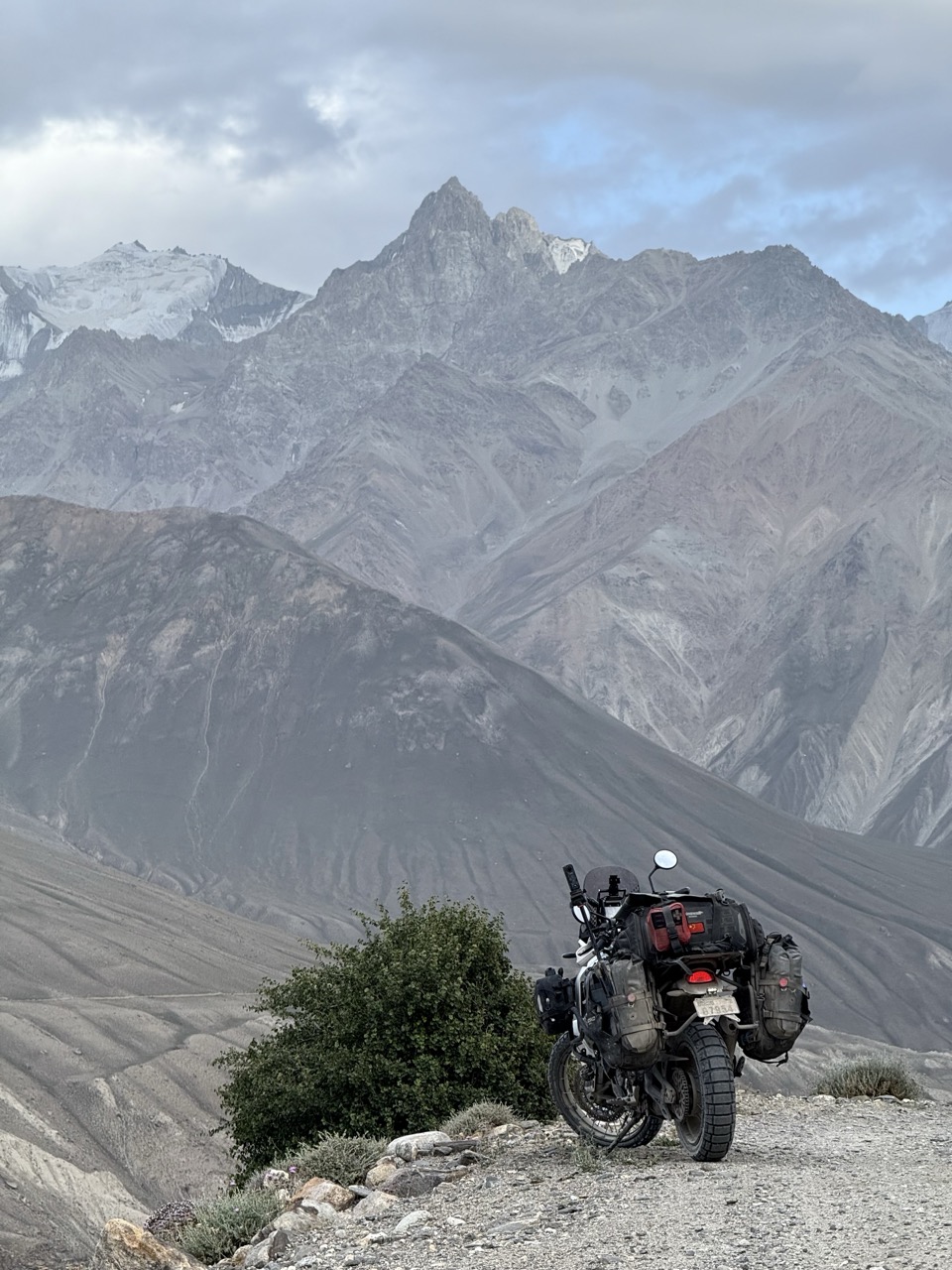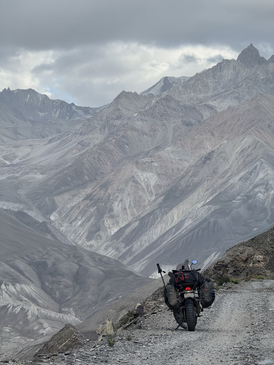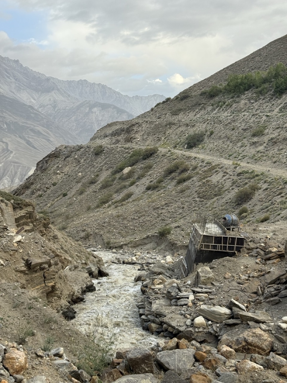 About half way through the route, it turns into the Wakhan corridor, which runs alongside the border with Afghanistan (the long panhandle bit which was there since colonial times to serve as a buffer between great powers. This panhandle is also is a dramatic mountain range, the Hindu Kush range, with a snowy peak >7000 MASL). This route is primarily unpaved, and is known to be a challenging ride.