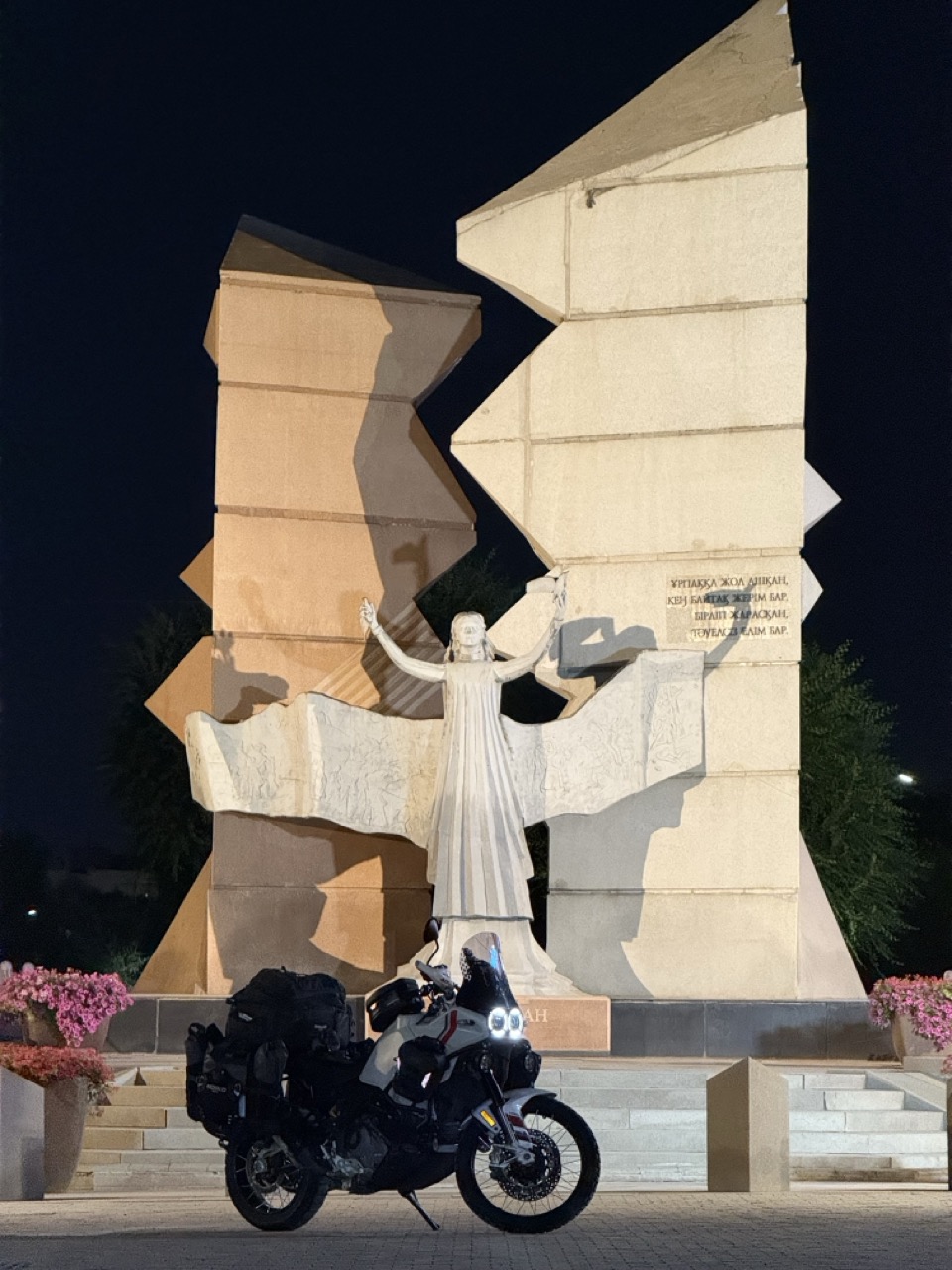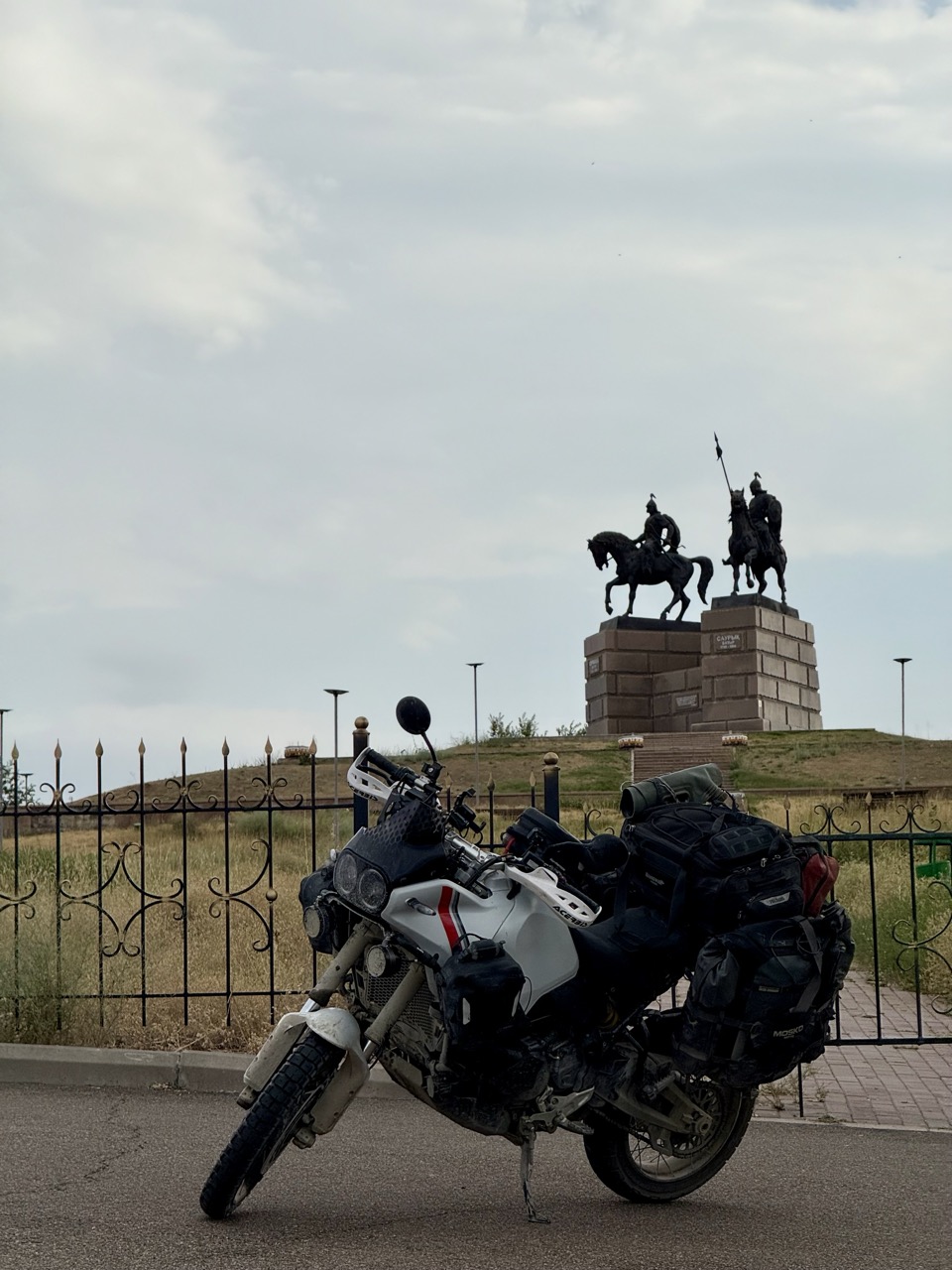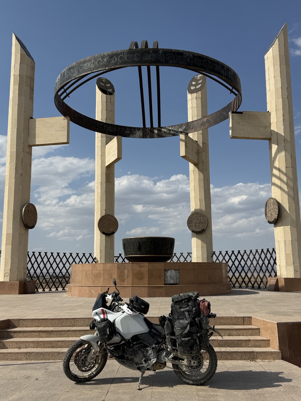 Sandeep (with a haircut) at the statue near the Kazakh border