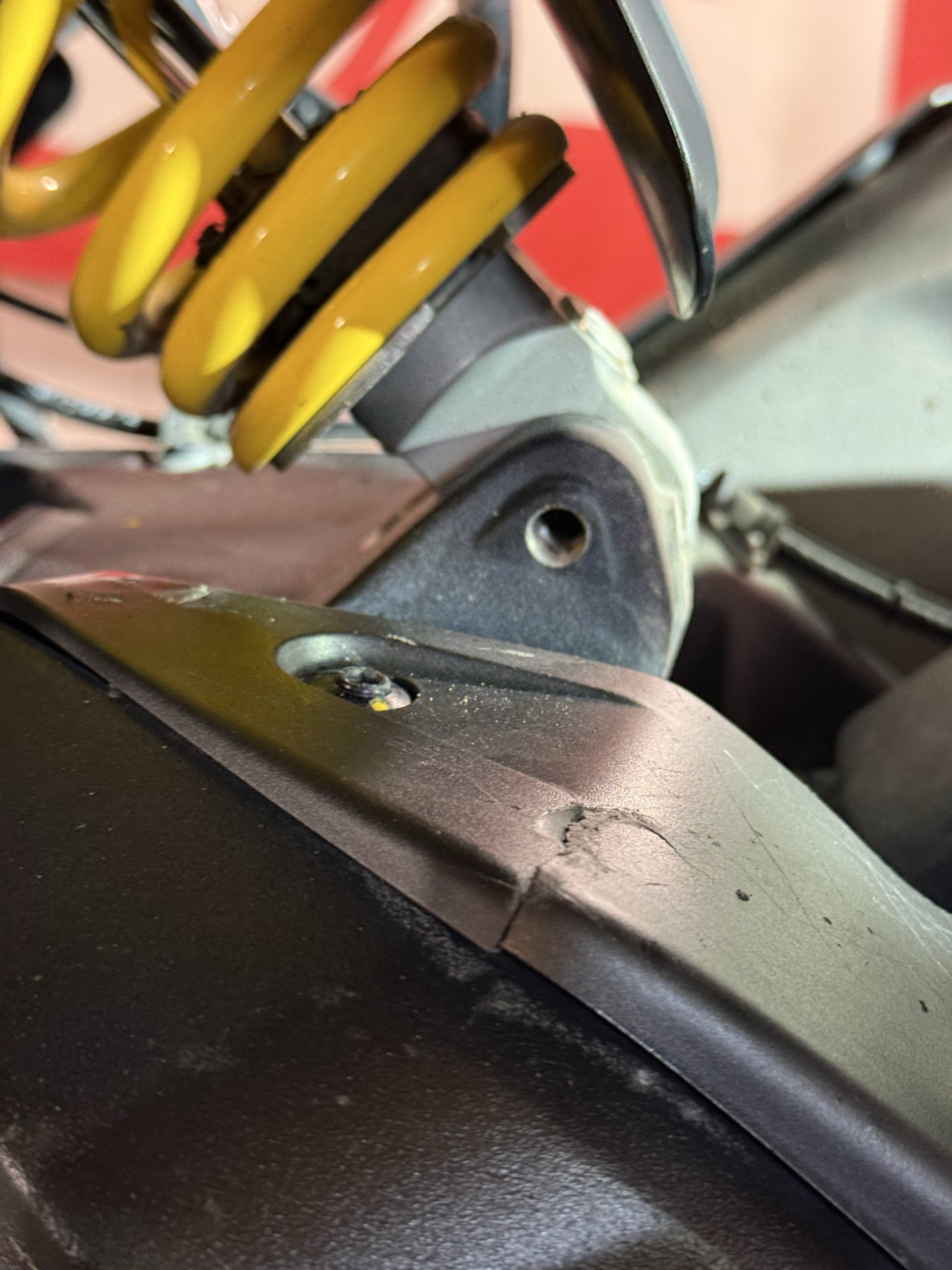 - the bolt securing the rear suspension had a missing nut! The existing bolt had bent from the force, so it was stuck