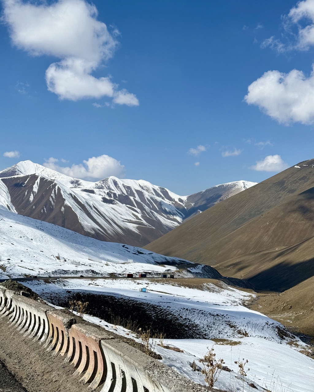 The rest of the day’s riding was interesting in that it was riding the exact same road, only ~2.5 months later. I was curious as to how the ride would be different…and wow was it different: Roadworks which were in progress the first time I passed, were largely complete. Roads were very fresh and very nice. The seasons had changed. Mountains went from being cool dark brownish green to snowcapped. The temperature was very different; previously ~10-15 degrees. This time it was 2-10 degrees. I saw a few new projects; a small glamping site of ~10 tents had been set up.