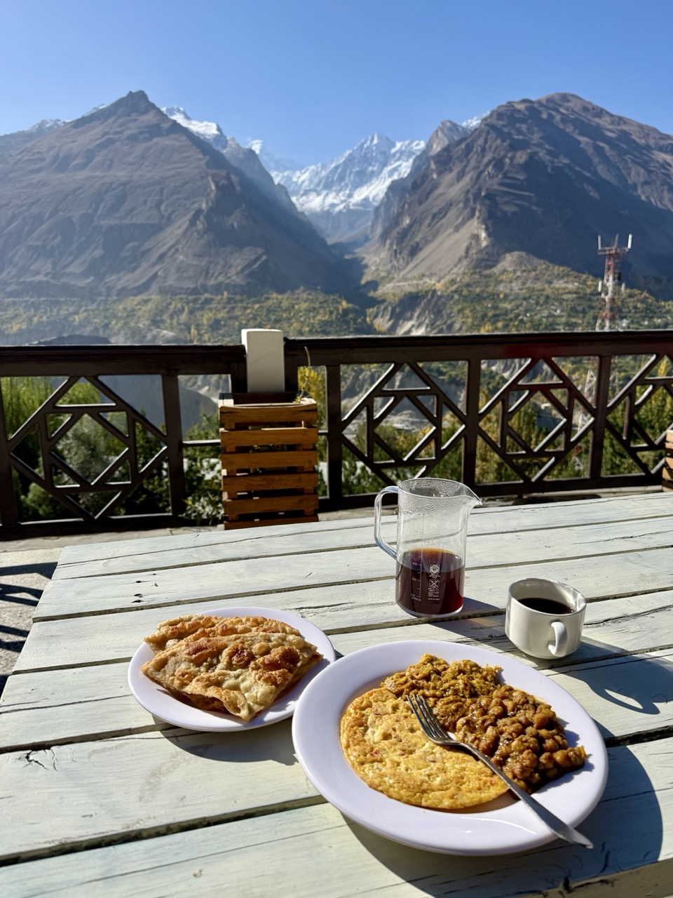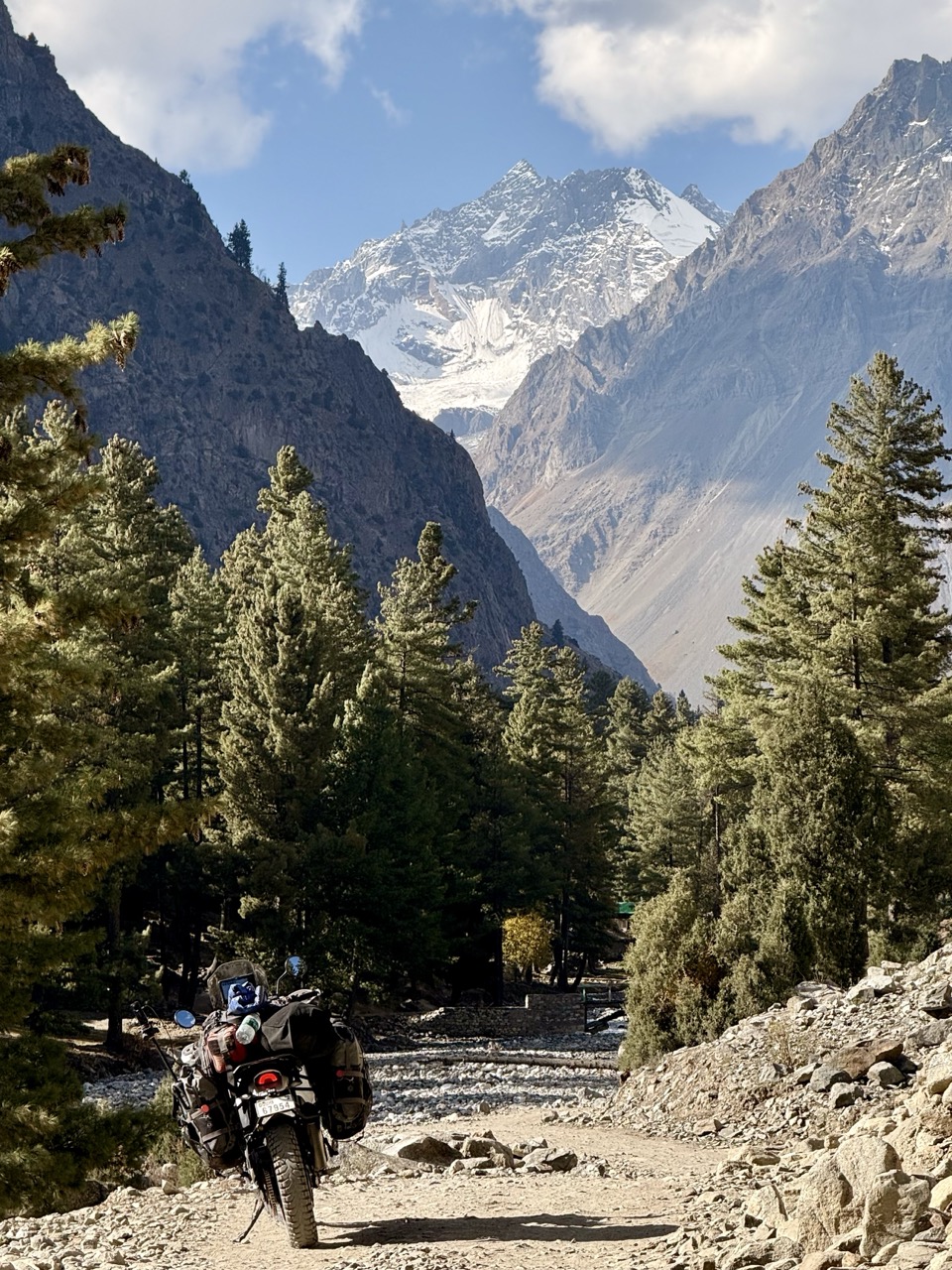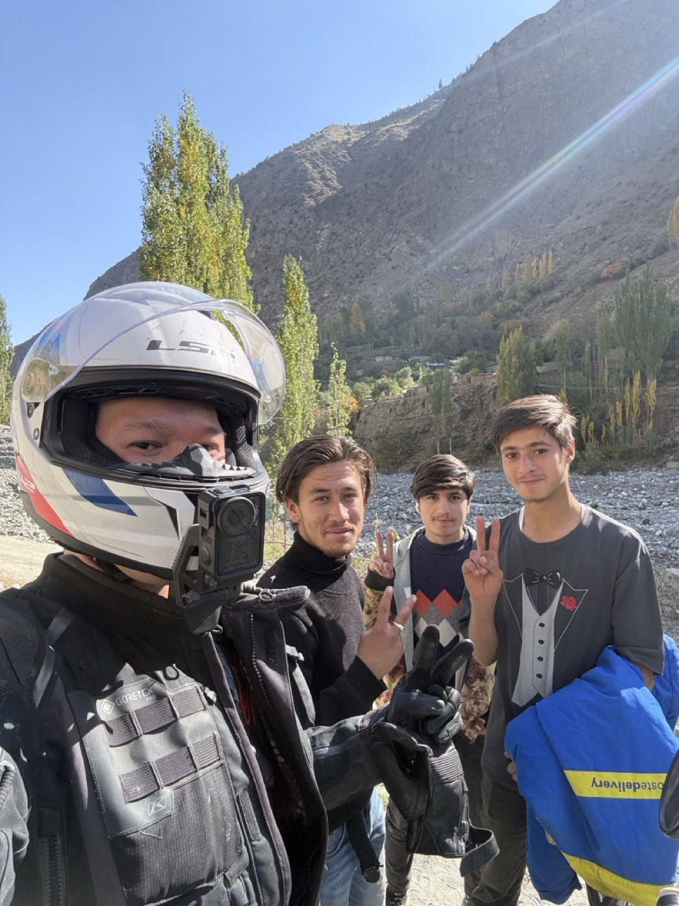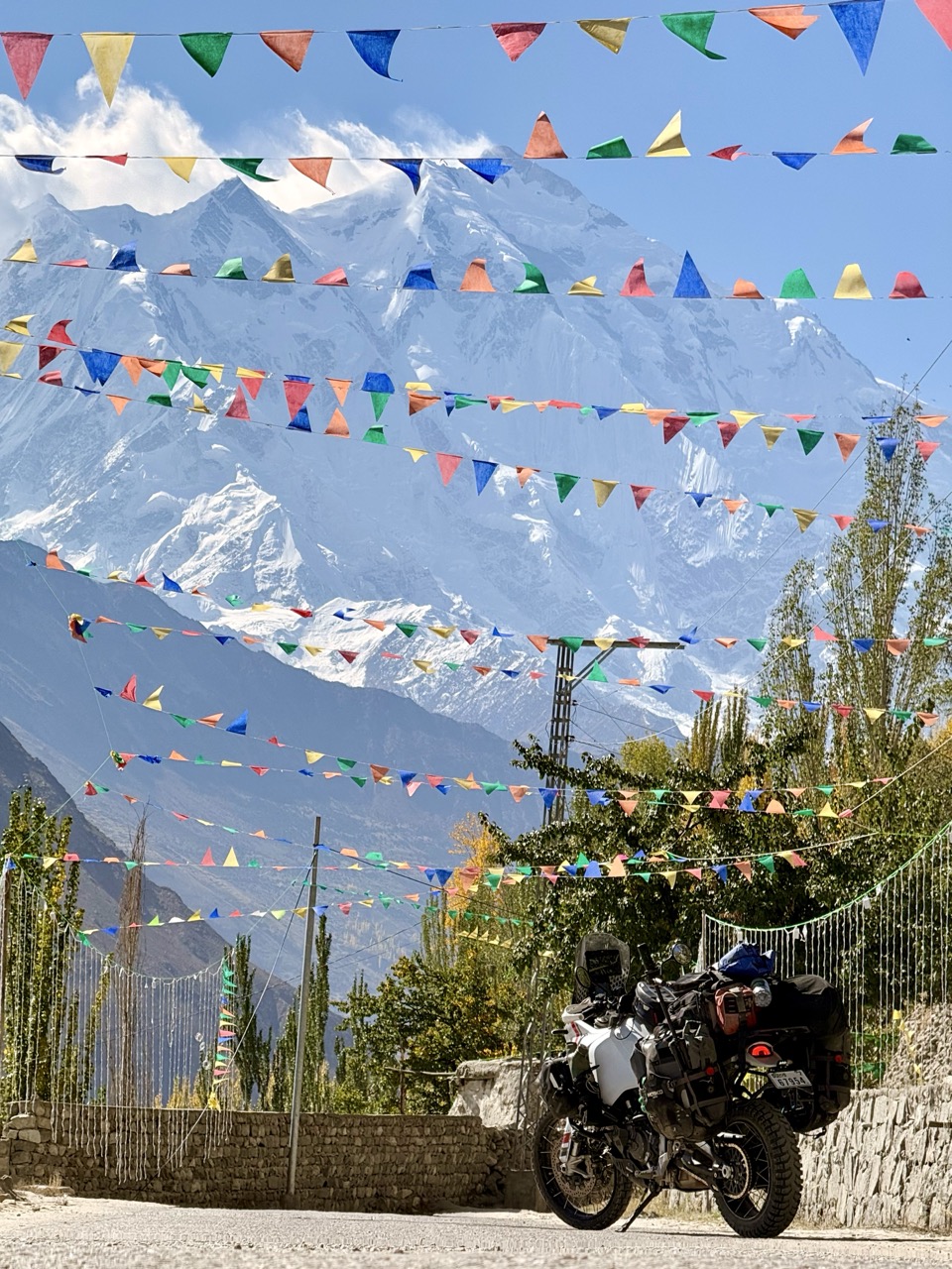 It was quite fun and lighthearted ride; I slowly made my way through little mountain villages with bumpy roads, colourful flags and mountain views, stopping frequently to take photos. It honestly looks like a blessed or elven land here in Hunza with the sun catching the leaves of autumn trees, leaving glowing patches of yellow and orange among rocky cliffs and snowcapped peaks. I find myself on occasion forgetting which side of the road to ride on; Pakistan is on the left (which is contrary to most of my riding, since Thailand), so once or twice I have been riding on the right, much to the confusion of drivers here (until I see them approaching and their confused looks, and then revert to the correct side!)
