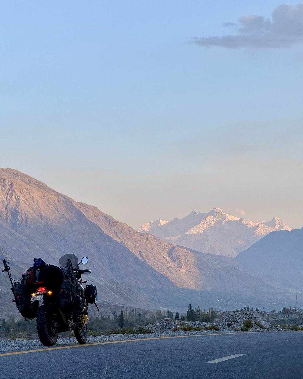 As i filled up my bottle from the stream, along came a group of bikers who were riding small capacity bikes. We stopped for photos and chatted for a while. I asked about the route ahead: “how is the road? Like this?” “It’s an adventure! Another 30 minutes but the sun has dropped beneath the mountains so it is not as beautiful”. When I shared that I was keen to end the afternoon in Gilgit, they recommended that I don’t proceed, since it would soon get dark.