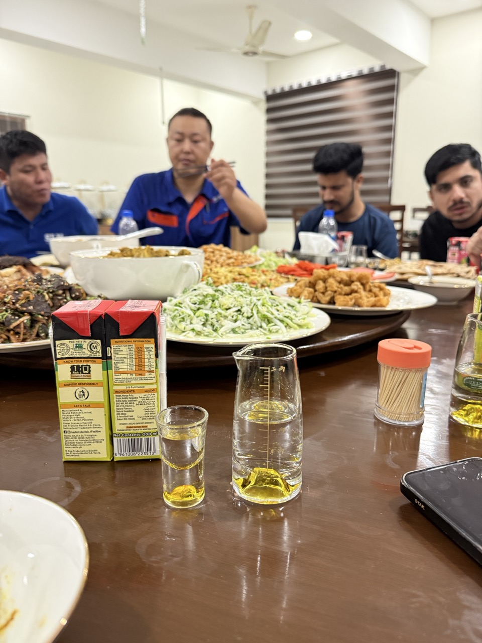 Dinner was with my friends cousin, his roommate, and the 9 Chinese staff on site. They had smuggled in some Baijiu in disguise as a chemical cleaner, so there was quite a lot of drinking. There was also no escape! Each person got a 100ml carafe, from which they filled their shots. Since everyone drinks at the same time, the expectation is that everyone’s carafe would be empty at the same time…unless they were under-filling their shots (like I was). And so as a countermeasure, the final shot would be drinking the remainder of the carafe(!), so there would be no slowing down relative to the group.